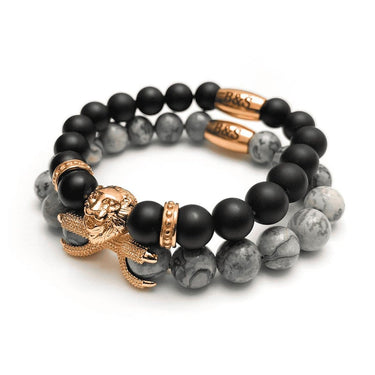 The Rose Gold Lion & Grey Stones Set is versatile enough to match any outfit. Whether you're wearing a suit or jeans and a T-shirt, these bracelets will add a touch of elegance and originality to your look.